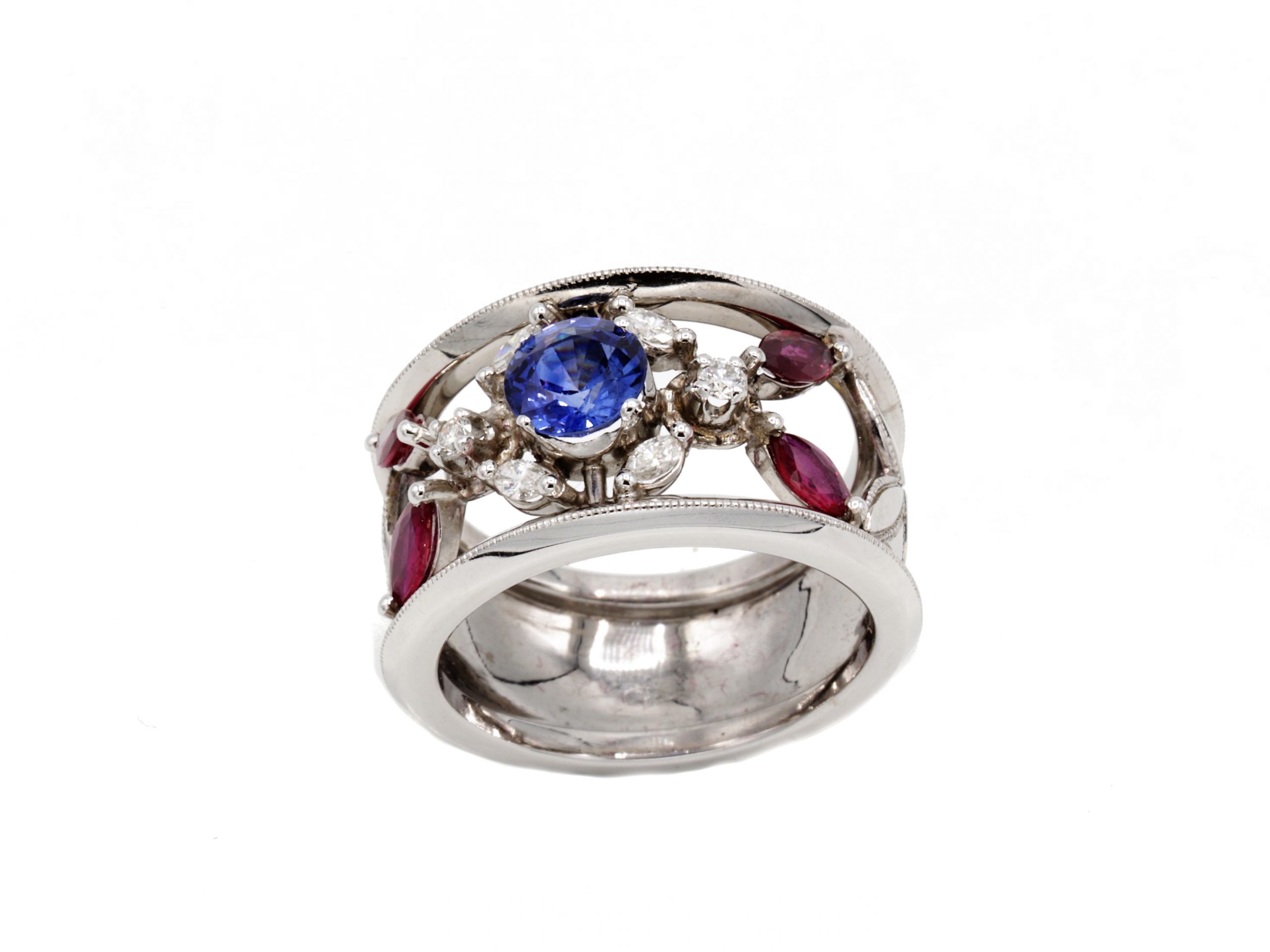 Ouro branco 19,2kt, banho de ródio, flor de safira azul de Ceilão, navetes de rubis, diamantes lapidação brilhante, aro em gume com miligrife