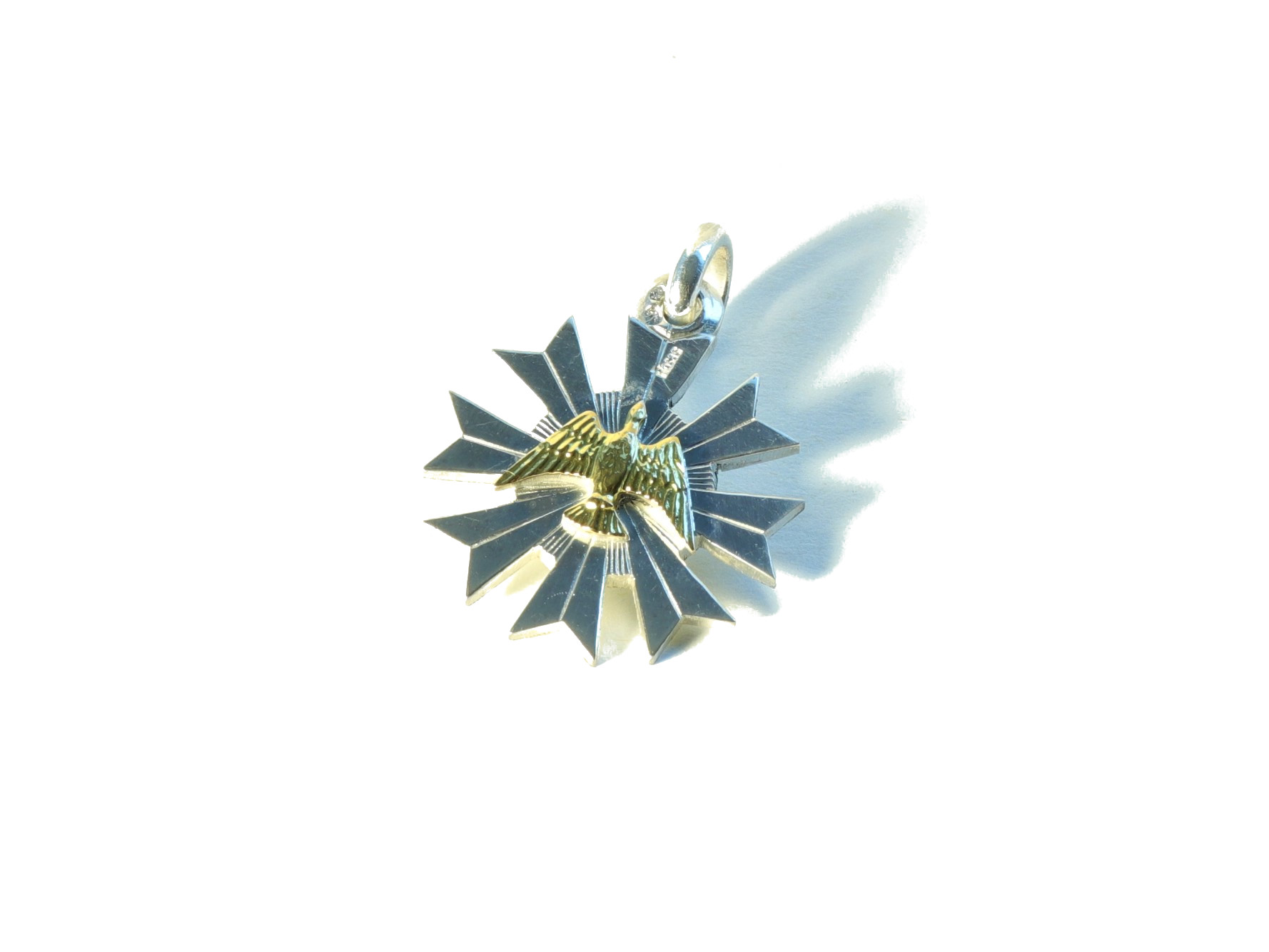 Resplendor Espírito Santo Prata, ouro, estampado acabamento manual REF: MEDPRT001 Descrição Prata de lei 925%, ouro 800%, fundida e acabamento manual Desenho exclusivo ROSAS Ver também: Artigos Religiosos << voltar à lista